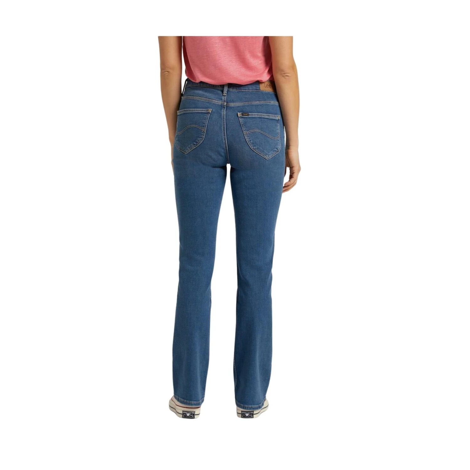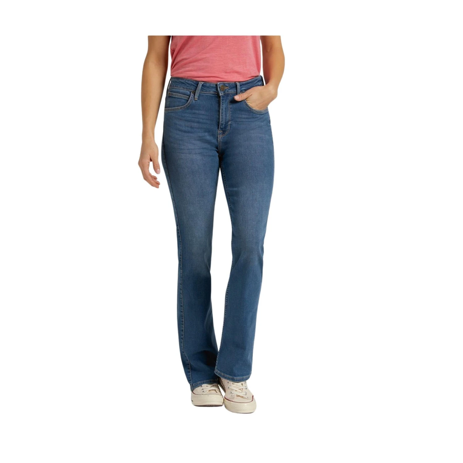 84% Cotton / 14%Polyester/ 2% Elasthanne. Coton recyclé pré-consommateur,polyesterrecyclé. Taille haute, moulant à la cuisse, étroit au genou, coupe bootcut et braguette zippée. Ce modèle est teint à l’aide du procédé Crystal Clear qui utilise moins d’eau, moins de produits chimiques et sans sel.